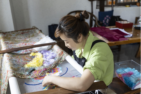 在陈云珍的工作室,像宋琴一样全职从事羌绣的员工共有10个。截至目前,工作室在全县累计培训羌绣学员达2万多人,直接带动就业300多人,其中不乏妇女和残疾人。此外,作为中国妇女发展基金会“天才妈妈”项目四川省北川县羌绣梦想工坊的带头人,陈云珍定期开设羌绣针法技巧、色彩搭配、实操制作等课程,辐射带动妇女增加收入、改善生活,为乡村全面振兴贡献力量。