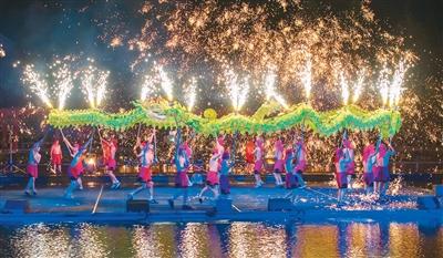 江苏省连云港市渔湾风景区举办非遗打铁花表演,丰富了游客夏夜生活。