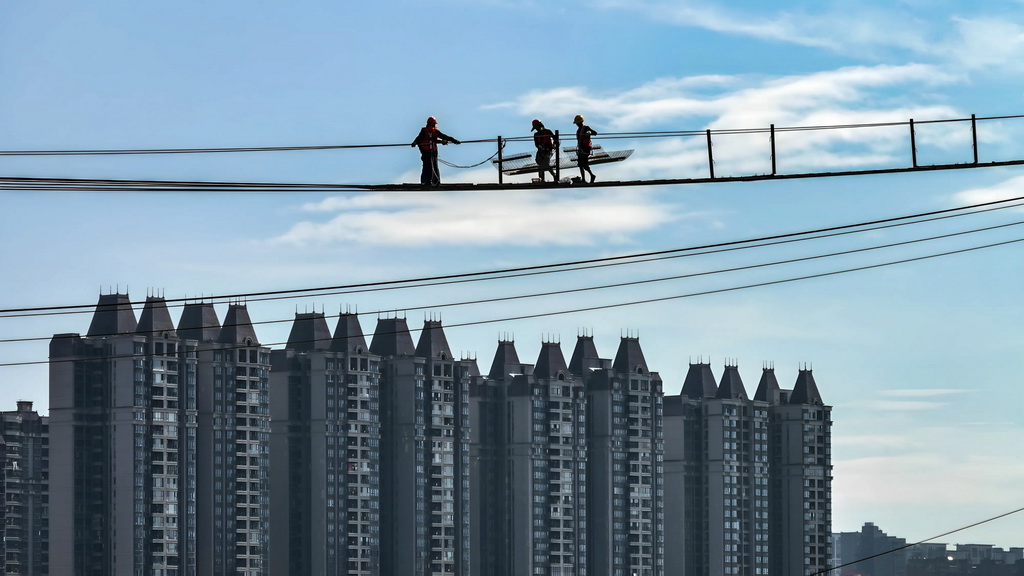 施工人员在建设中的钦州市子材大桥施工(8月24日摄,无人机照片)。