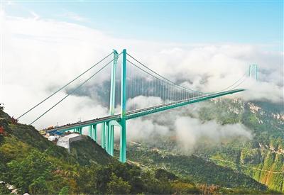 花江峡谷大桥是贵州六枝至安龙高速公路的关键控制性工程。大桥全长2890米,主桥跨径1420米,桥面到水面高度625米,主桥跨径居山区桥梁跨径世界第一、桥梁高度居世界第一,被称为“横竖”都是世界第一。