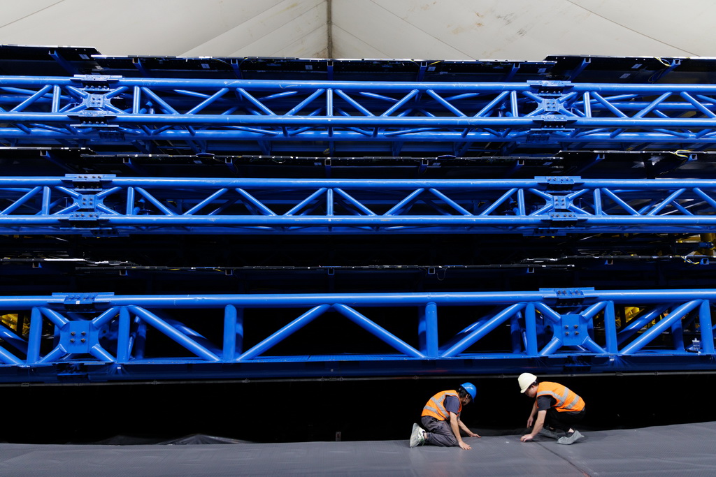 11月18日,工人在江门中微子实验大厅铺设地垫,其顶上三层是缪子探测装置。