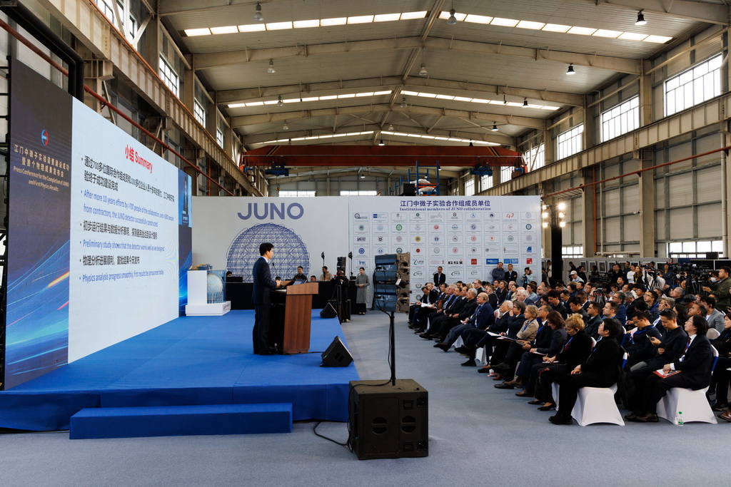 11月19日,中国牵头的国际合作项目江门中微子实验(JUNO)装置在广东省江门市发布了其建成后的首个物理成果:研究人员通过对今年8月26日至11月2日共59天有效数据的分析,测量出描述中微子振荡的两个参数,精度比此前实验的最好记录提高了1.5-1.8倍。这意味着其探测器关键性能指标全面达到或超越设计预期。